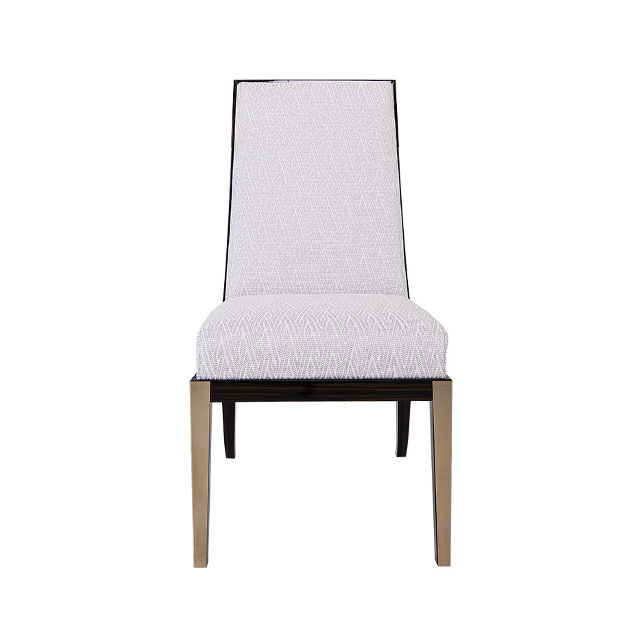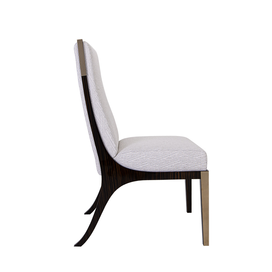The frame is crafted in a Macassar Ebony with a High Gloss finish that beautifully contrasts the light upholstery, highlighting the chair’s clean lines and sculptural form. A gently curved rear leg detail adds a distinctive architectural element, while the front legs are accented with sleek Brushed brass, introducing a touch of understated glamour.