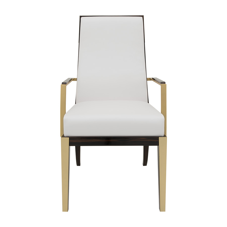 Polished brushed brass armrests and front legs introduce a refined contrast, their warm metallic finish adding a touch of glamour while enhancing the chair’s structural clarity. The slender metal arms float elegantly between the backrest and seat, creating a sophisticated interplay of materials—wood, metal, and upholstery—that defines the chair’s distinctive character.