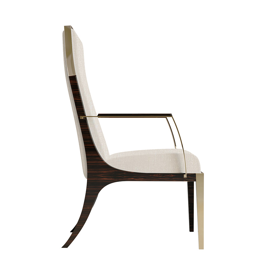 The frame is crafted in a Macassar Ebony with a High Gloss finish that beautifully contrasts the light upholstery, highlighting the chair’s clean lines and sculptural form. A gently curved rear leg detail adds a distinctive architectural element, while the front legs are accented with sleek Brushed brass, introducing a touch of understated glamour.