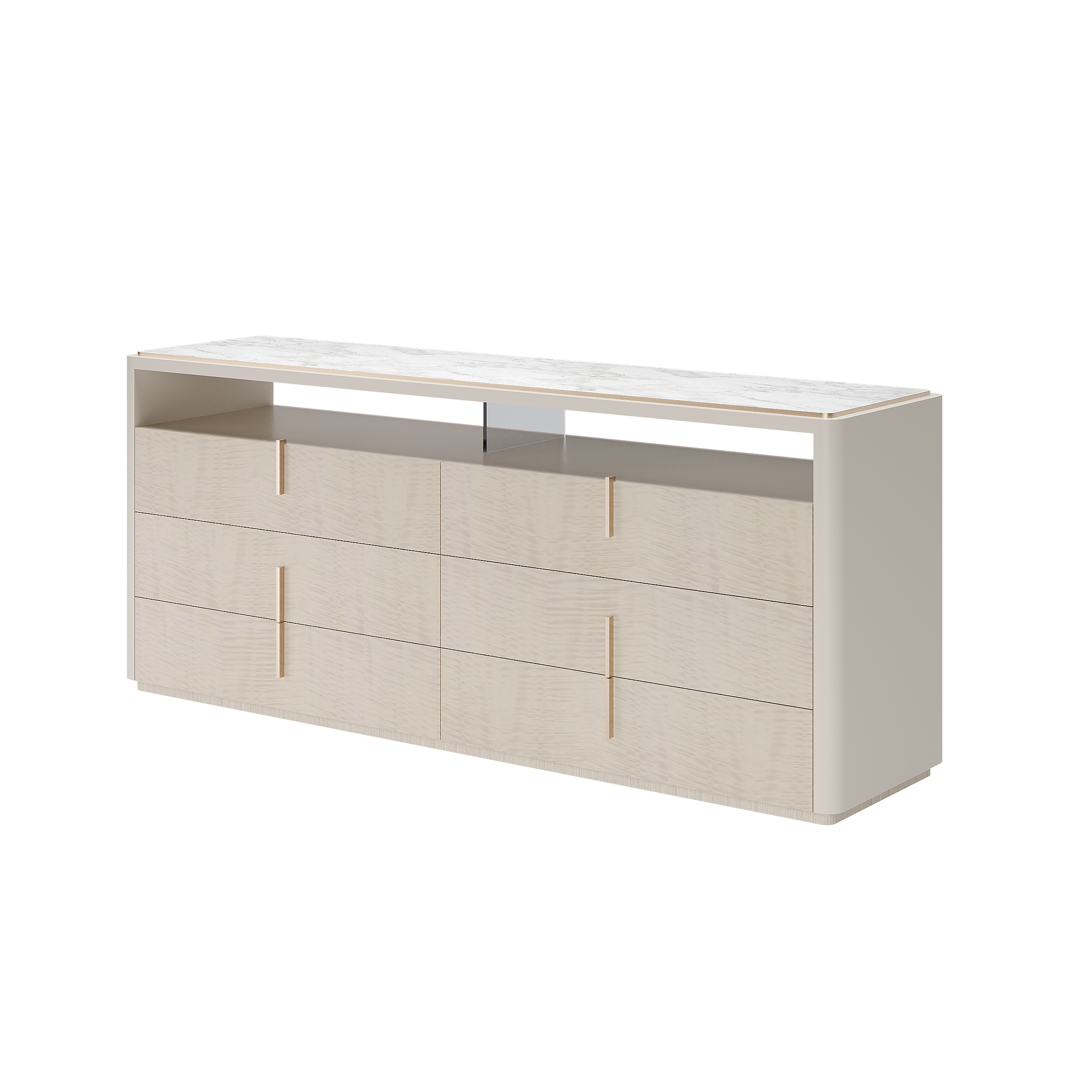 This sleek and modern dresser features ivory lacquer sides and six drawers in a Sycamore Sand wood with a high gloss finish. This piece showcases M03 brass details and hardware on the six drawers. Above the drawers there is an open shelf, accented with a lacquer interior.