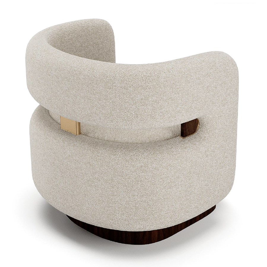 The chair rests on a rounded Walnut base, which grounds the design and introduces a rich material contrast to the soft upholstery. Overall, the armchair blends Italian modern elegance with mid-century influences, making it ideal as a statement lounge chair in high-end living rooms or bedrooms.