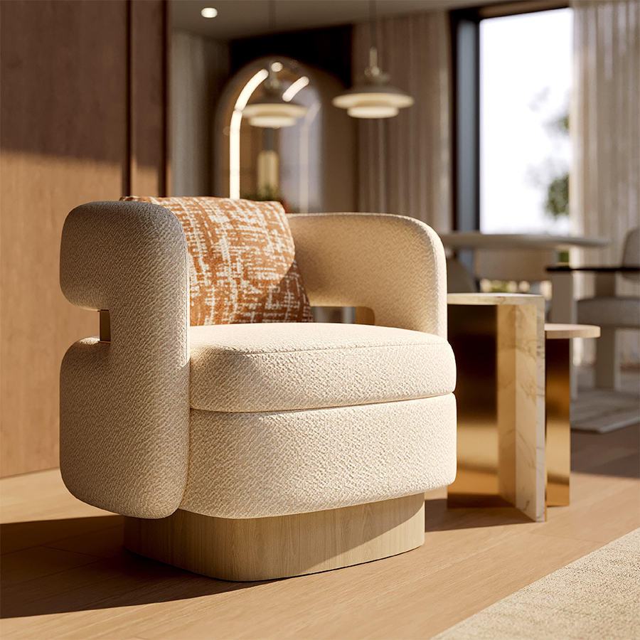 This armchair has a sculptural, enveloping silhouette that feels both modern and softly luxurious.  The Yoko Armchair is fully upholstered, giving the chair warmth and tactile depth. The curved back and integrated arms wrap around the seat in one continuous form, creating a cocooning, lounge-like comfort.