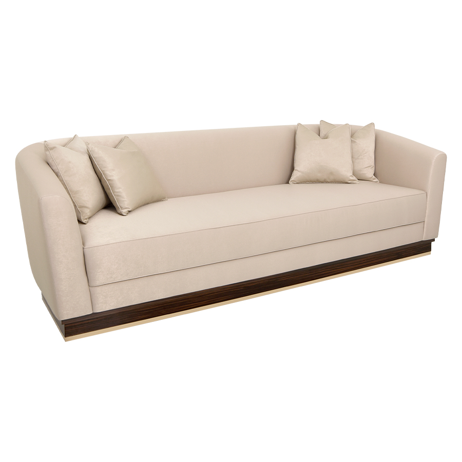 The Perry Sofa is tightly upholstered sofa with a curved back and sleek lines. The base is crafted in medium Walnut with a High gloss finish and is accented with a smoked brass detail.