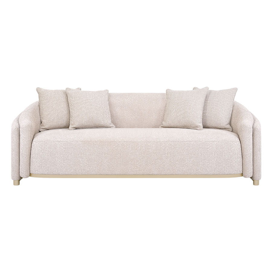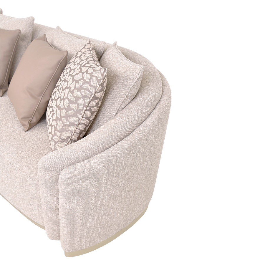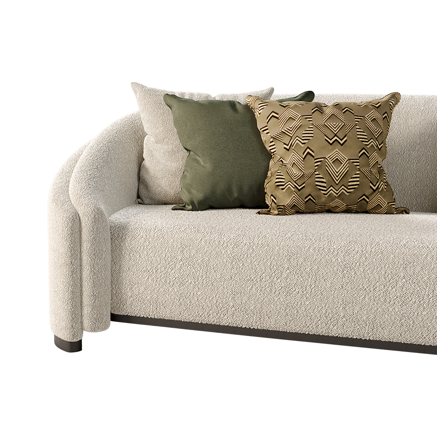 The Santorini Sofa is tightly upholstered sofa with a double rounded back support. The base and legs are crafted in brown oak.