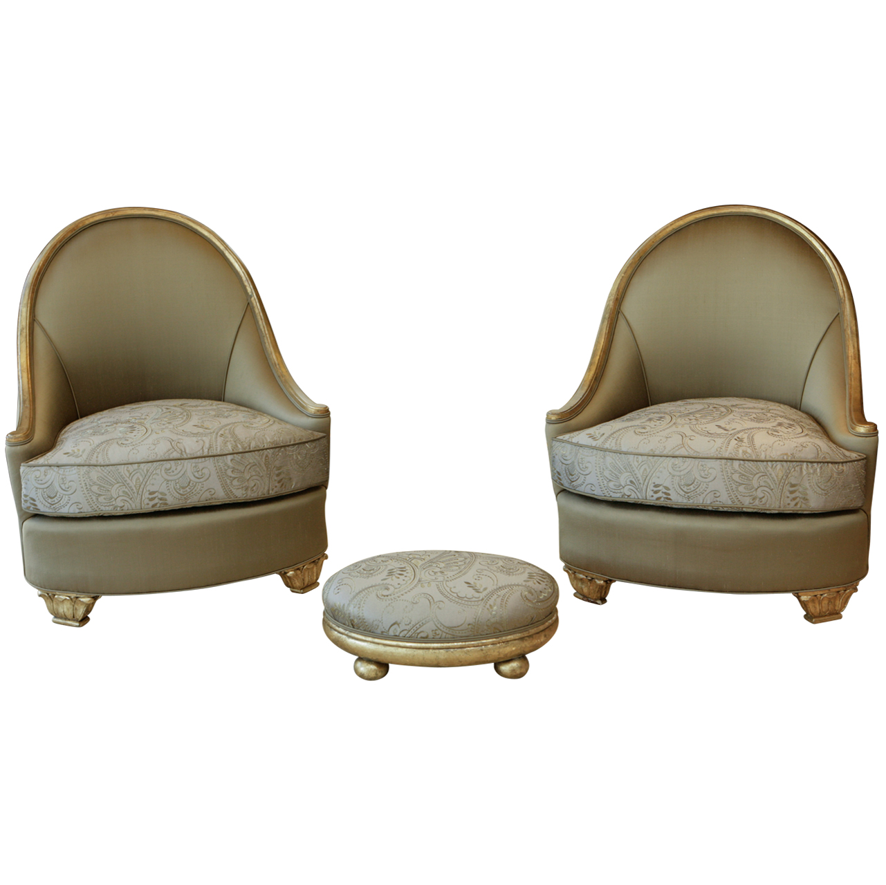 Neoclassical lounge chairs with carved silver leaf base and ivory fabric